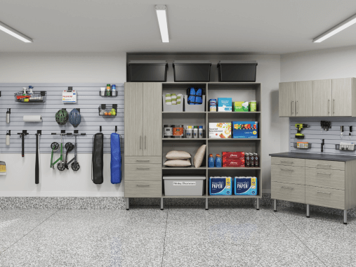 Our range of shelving and cabinetry systems for garages have numerous options to personalize and perfect your product. We offer multiple colors of product, as well as soft-close slides or hinges. If desired, all hardware can be optioned with either bright or dark finishes to best match any existing installations or to best improve the look of your new custom garage storage system!