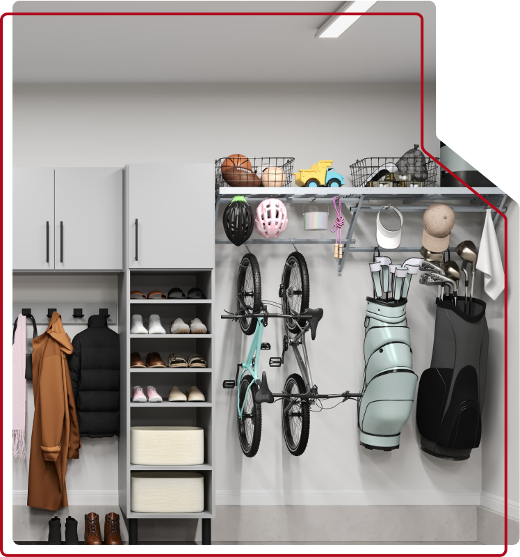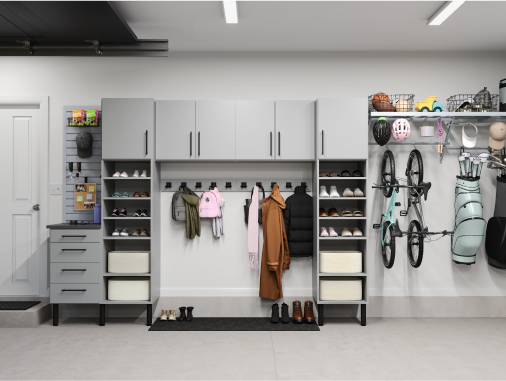 Our systems allow a huge amount of customization and appearance options to fit all your needs and aesthetics. With a large variety of color and finish options, plus the ability to add as many or as few garage shelves or custom cabinets as you could ever need, everything will have a place, while blending into the design language of your home!