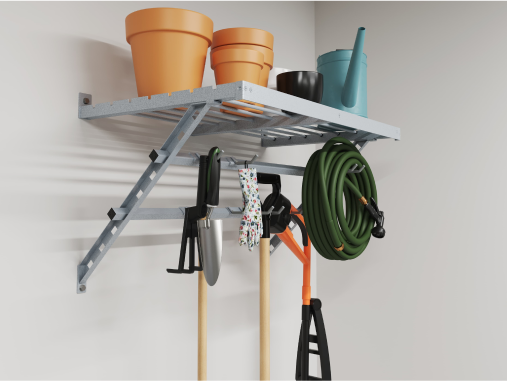 The Garage Essentials system can be expanded to multiple widths and configurations to best fit your garage storage and hanging needs! With certain accessories, multiple bicycles, sports equipment, and more can be easily hung up and out of the way in your garage. These shelves also have a wire mesh surface above to hold various boxes or baskets for long-term storage.